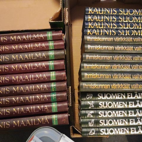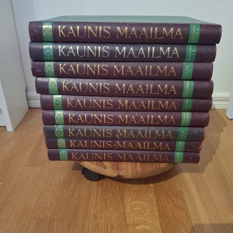 Kaunis maailma osat 1-9 eli yhdeksän osainen eri maanosista kuvinkin kertova kirjasarjakokonaisuus. Näköjään nidottu 60-luvulla Italiassa. Kolme osaa Eurooppaa, kaksi osaa Aasiaa, kaksi osaa Amerikkaa, yksi osa Afrikkaa ja yksi osa Australia ja Oseaniaa.