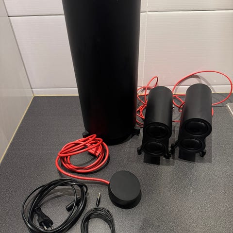 Logitech kaiutinjärjestelmä, jossa on mustat kaiuttimet ja subwoofer. Järjestelmä sisältää johdot ja erillisen ohjausyksikön äänenvoimakkuuden säätöön. Soveltuu kotikäyttöön äänentoistoon.