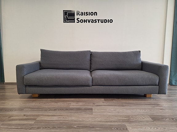 Myynnissä harmaa 2,5:n istuttava sohva. Näyttävien kaarijalkojen, sekä kapeiden käsinojien ansiosta sohva on hyvin ilmava ja tyylikäs. Kapeiden käsinojien ansiosta sohvan istuin leveys on saatu maksimoitua. Sohvan runko ja jouset ovat ehjät. Istuin ja selkätyynyjen kankaat ovat irroitettavissa pesuun. Lisäksi sohvaan on valittu tehtaalta lähtiessään ympäriverhoillut istuin ja selkätyynyjen kankaat. Tyynyt siis käännettävissä. Tämä luonnollisesti tuplaa kankaiden, että tyynyjen käyttöiän. Sohvan hinta: 259e.