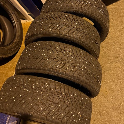 Nokian nastarenkaat joissa tasaisesti pintaa noin 6mm. Nastat ehjiä ja tallella.