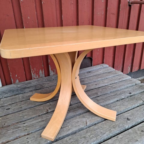 Koivuinen, mahdollisesti Iskun koivuinen sohvapöytä. Joitakin käytönjälkiä on, mutta yleisilme on siisti.