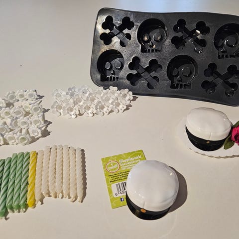 2 ylioppilaslakkia,kynttiläpidikkeitä, pääkallo/reisiluujääpalamuotti