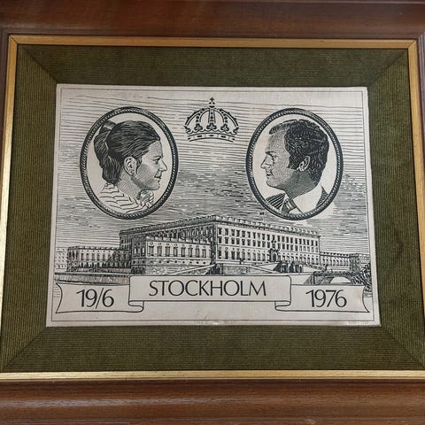 Hopeinen muistolaatta Ruotsin kuninkaallisten häistä 1976