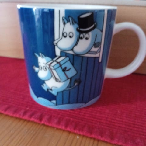Arabia Muumi Mukin jouluyllätys. Kupin väri on sininen ja siinä on Muumi-aiheinen kuvitus. Uuden veroinen kunto!
