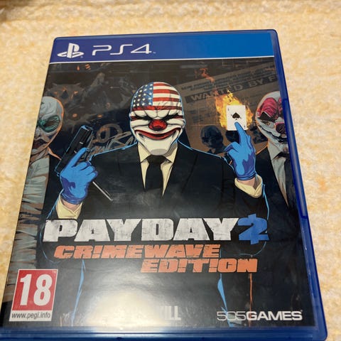 Payday 2 Crimewave Edition on Playstation 4 -peli. Toimintapainotteinen moninpelattava rikospeli, jossa pelaajat suorittavat erilaisia ryöstötehtäviä. Ikäsuositus 18 vuotta.