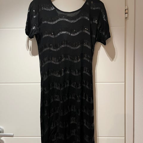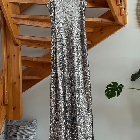 Pitkä, säihkyvä, vaalea/samppanjanvärinen paljettimekko loppuvuoden juhlatilaisuuksiin. Hieman leveät hihat, v-kaula-aukko sekä rintojen alla/vyötärön yläosassa sauma. Kiinteä alushame. Käyttämätön, kerran sovitettu. Vastaa kokoaan.
