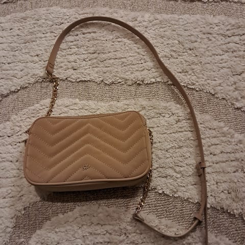 Käsilaukku leveys 40 cm, korkeus 32 cm, syvyys 17 cm. Sisällä yksi vetoketjullinen tasku ja kaksi lokeroa. Käytetty vain kaksi kertaa lentolaukkuna.