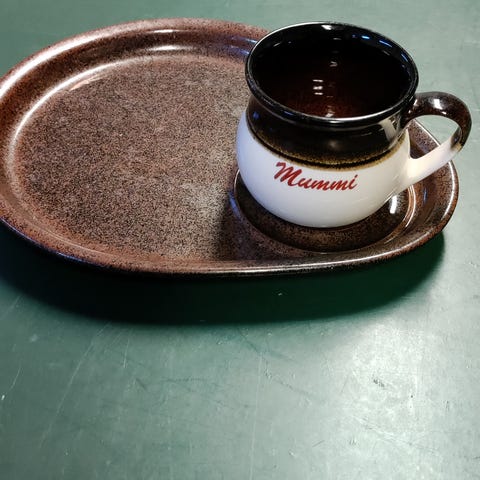 Kerman savi muki 5 kpl, mummi, pappa, äiti, isä ja 1 kpl ei tekstiä, halkaisija 7,5cm ja korkeus 7,5cm, täysin ehjiä ja kirkkaita ei sameita eikä harmaantuneita, yht.h.23€. postitus ja nouto.