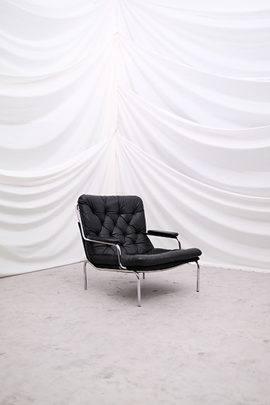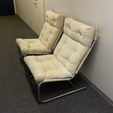 Veistoksellinen pari vintage-nojatuoleja, joissa yhdistyvät teräsrunko ja kauniisti patinoitunut nahka. Muotoilu on rohkea ja selkeälinjainen – kevyt mutta vahva läsnäololtaan. Tuotu saksasta 80-luvulla.
