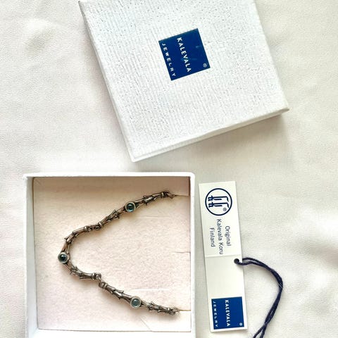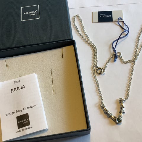 Käytössä ollut Kalevalan hopeinen Juulia-kaulakoru topaasi kivellä. Leimat: kk ja 925. Ketjun pituus 42/45 cm. Rasiaa ei ole. Pakettiautomaattilähetys Manner-Suomeen 6 euroa, josta saa lähetyksen seurantanumeron. Nouto Kuopiosta keskustasta.
