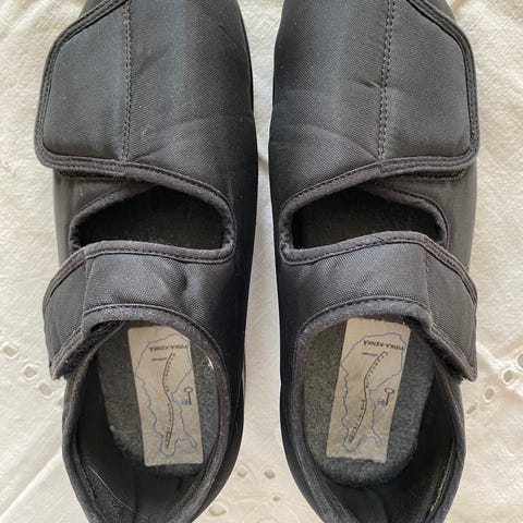 Käytössä olleet hyvä kuntoiset jalkineet.Vasemman puolen kengän repsottavaa pohjallisen päätyä hieman siistitty liimailemalla.