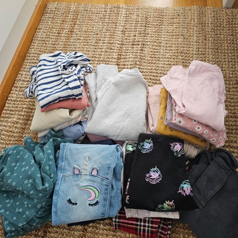 Ehjiä vaatteita seuraavalle. Koot 92-98. Mukana myös ystävän tekemiä vaatteita. Tyttömme on hoikka, joten housut tehty niin, että pysyy ylhäällä. Timanttihousut ohuimmat ja polvista haalistuneet.