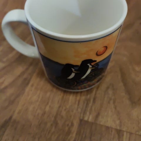 Arabia Pingviinit muki, posliinia, jossa pingviiniaiheinen kuvitus. Muki soveltuu kuumien ja kylmien juomien tarjoiluun.