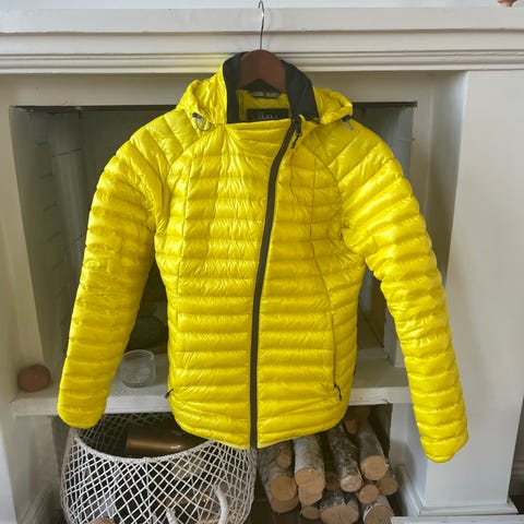 Muutaman kerran käytetty polvipituinen untuvatakki, missä veden- ja tuulenpitämä kangas.