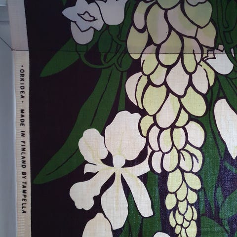 1 kappale Tampellan vanha kangas/verho nimeltään lilja. Kissatalous. Leveys n.122 cm ja pituus n.210cm. yhden reiän löysin ja väri tahran.