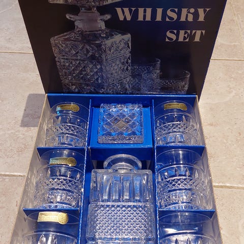 Viini/cherry setti, karahvi + kuusi lasia, 24 %PbO, käyttämätön sarja, ollut vain vitriinissä esillä.