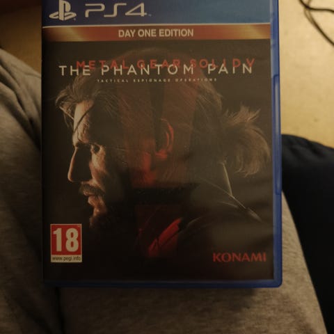 Konami The Phantom Pain Playstation 4 peli Day One Edition. Ikäsuositus 18+. Peli on fyysisessä kotelossa, joka näkyy kuvassa.
