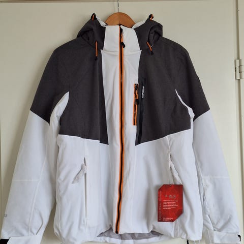 Sinivalkoinen naisten laskettelutakki. Vain muutaman kerran käytetty, joten on todella hyvässä kunnossa. Hissilipun saa hihataskuun, lumilukot lantiolla, hupussa ja helmassa kiristynauhat.