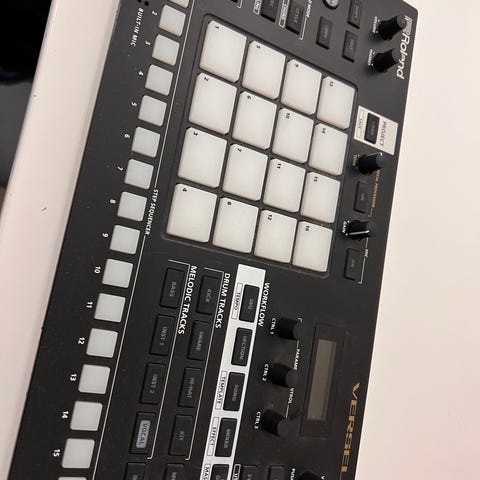 Novation Circuit Tracks on groovebox ja MIDI-ohjain, jossa on useita säätimiä ja painikkeita musiikin luomiseen ja ohjaamiseen. Laite on musta ja sisältää monipuoliset liitännät, kuten MIDI-portit ja audio-liitännät. Sopii musiikin tuottamiseen ja live-esityksiin.