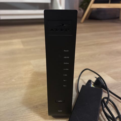 Arris Modeemit Modeemi mustassa kotelossa, jossa useita Ethernet-portteja ja LED-merkkivalot. Laite soveltuu verkkoyhteyden jakamiseen kotiverkossa tai pienessä toimistossa.