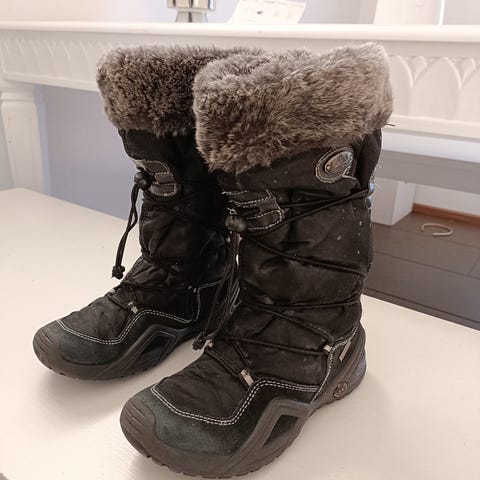 Mustat talvikengät. Nauhat ja sivuissa vetoketjut. Vuori. Käytetyt, pientä kulumaa. Ei eläintalous.