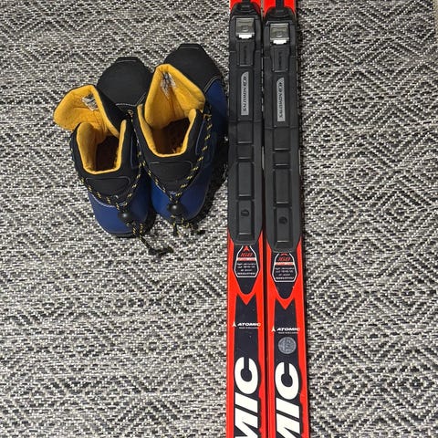 Atomic Ace -hiihtosukset ja sauvat. Käytön jälkiä näkyy jonkin verran. Salomon-siteet.