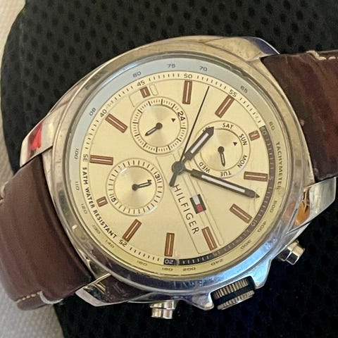 Tommy Hilfiger miesten rannekello, jossa on ruskea nahkaranneke ja musta kellotaulu. Kello sisältää kronografitoiminnot ja roomalaiset numerot kellotaulussa. Patteri loppunut ja ranneke vähän kulunut muuten kunnossa.