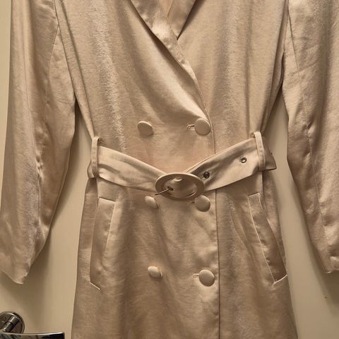 Minimalistisen kaunis, sileää satiinia kauttaaltaan. Helma hieman ryppyinen johtuen säilytyksestä, mutta suoristuu henkarissa.