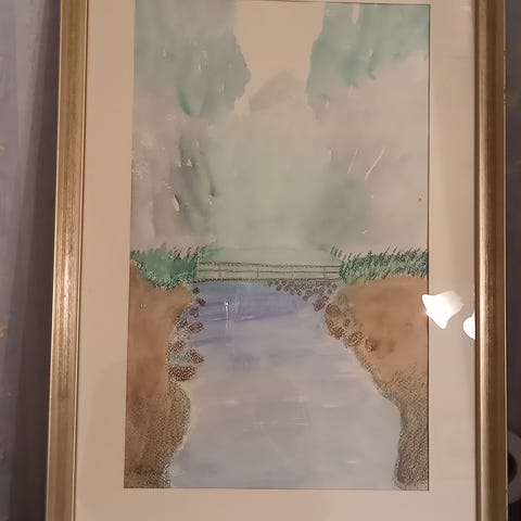 Maalaus, jossa maisemakuva, esittää puita ja järvimaisemaa. Maalaus on kehystetty koristeellisella puukehyksellä. Kehys on kultainen.