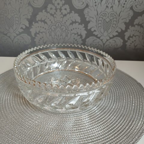 Myydään kuvan kaunis jalallinen vähällä käytöllä ollut tarjoilukulho, paksua lasia.