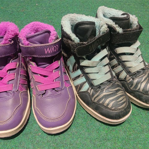 Myyn tyttöjen käytetyt, mutta hyväkuntoiset ”läskipohjaiset” mokkanilkkurit. Päällinen ja sisävuori sekä sisäpohjallinennahkaa. Ulkopohja raakakumia.