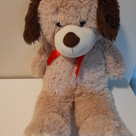 Koira ruskealla karvalla ja punaisilla rusetilla. Pehmeä materiaali, sopii koristeeksi tai leikkikaveriksi. Korkeus 30cm