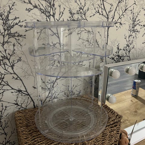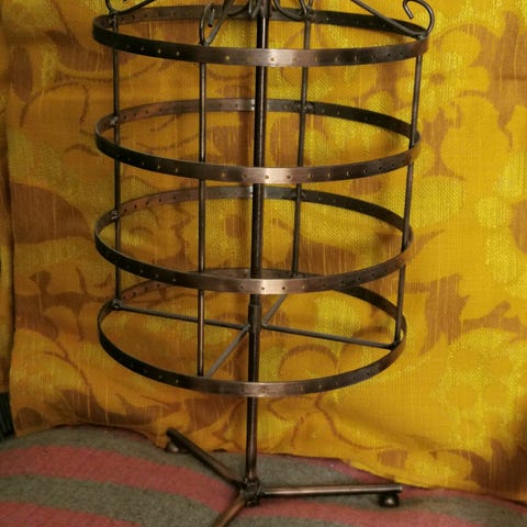 Kuvan mukainen hopeanvärinen teline riipuksille. Pyörivä. Muodostuu kahdesta osasta, siksi voi lähettää peruspakettina.