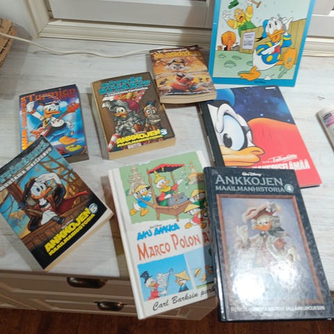 Aku Ankan taskukirjoja, seassa voi olla myös Roope-setää. Kätevästi sängynaluslaatikossa. Laatikon saa kaupan päälle.
