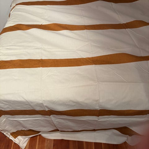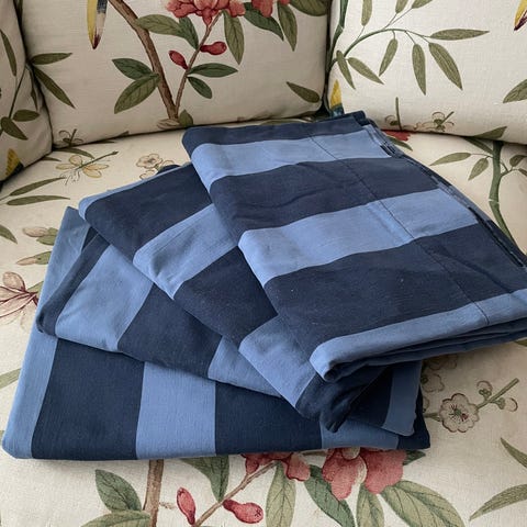 Siisti ja hyväkuntoinen vintage verho rypytysnauhalla, koko 140x184. Raita tummansininen. Pesty ja silitetty