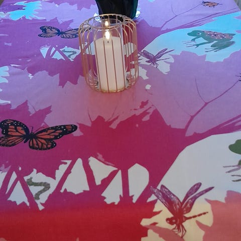 Valkoisella pohjalla, harmaita kuvioita. Pöytäliina uusi.