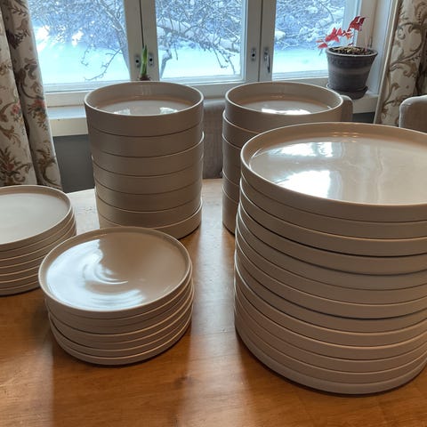 Hyväkuntoiseen settiin kuuluu iso lautanen, leipälautanen, jälkiruokakulho ja kuppi & tassi, 5kpl kutakin.
