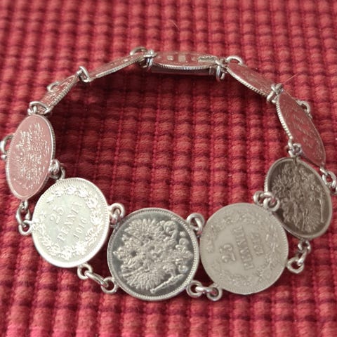 Kuvan mukainen kolikko rannekoru hopeaa kolikot Wilhelmiina Hollannin 10 senttiä v.1939-1941 painoa 22g ympärysmitta 18cm Hinta 35e nouto tai postitus kulut 3e kirjeenä seurannalla 6e