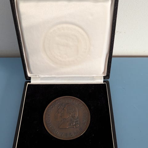 Taustapuoli: Teksti: “Universitas Varsoviensis condita anno MDCCCXVI inaugurata MDCCCXVIII studium iuris conditum MDCCCVIII 1958”. eli "Varsovan yliopisto, perustettu vuonna 1816, vihitty käyttöön 1818, oikeustieteellinen opintoala perustettu 1808, 1958" Reunassa kaksi laakerinoksaa.