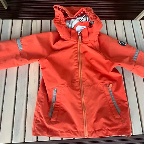 Käytetty mutta vielä ihan siisti yleisilme, jotain jälkiä, pientä haalistuma varmasti on, ei mitään selkeästi näkyvä ja heijastimissä jälkeä, sisällä nimikointi joka sutattu, esim. hihansuissa pientä haalea jälkeä. Vielä hyvä piha/rymy takiksi.