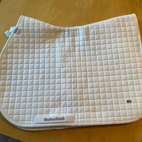 Vaaleanpunainen/pinkki satulahuopa siistillä harmaalla ja valkoisilla helmillä kanttinen estehuopa. Käytetty kisoissa muutamia kertoja. Siisti ja pesty, mutta sisäpuolella jäänyt hieman karvaa. Huoellisella harjauksella pitäisi irrota. Tarroissa hieman satulasta likaa, ei kuitenkaan vaikuta käyttöön.