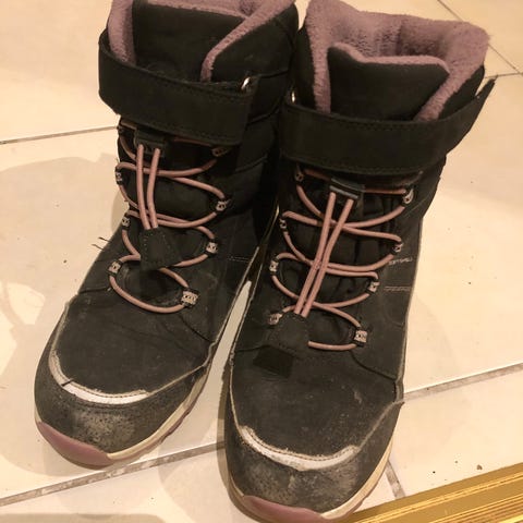 Mustat talvikengät tytöille, koko 36. Kengissä on lämmin vuori ja ne on suunniteltu kylmiin olosuhteisiin sopiviksi.