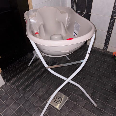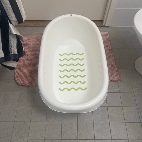 OK Baby Vannitoavaippa vauvan kylpyamme, valmistettu valkoisesta muovista, jossa vihreät liukuesteet pohjassa. Kylpyammeessa on ergonominen muotoilu ja reuna veden valuttamiseen. Sopii vastasyntyneille ja pienille vauvoille.