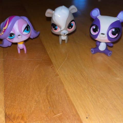 Myydään Littlest Pet Shop hahmoja kolme kappaletta. Hahmot ovat hyvässä kunnossa, mutta reunimmaisessa koirassa käytönjälkiä.