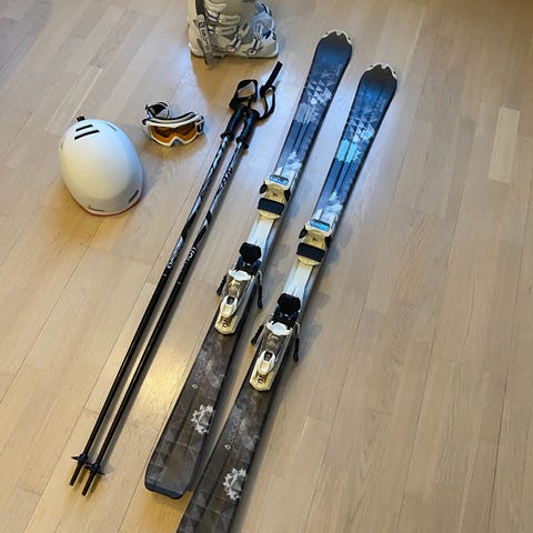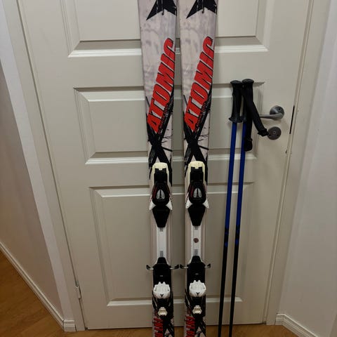 Naisten valkoinen Atomic-setti, vanhat mutta vähän käytetyt Cloud-sukset (katso kaikki kuvat!) sekä sauvat.