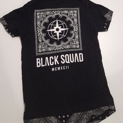 Malli: Kapeat lahkeet, resorit, sivuissa Black Squad -tekstinauhat.
