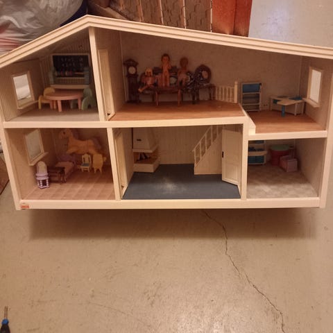 Ihana nukkekotitalli, yläkerrassa asunto ja alakerrassa talli. Osat saa pakattua kätevästi talon sisään leikkien välissä. Monipuolinen, osia voi järjestellä eri tavoin.