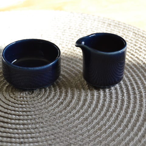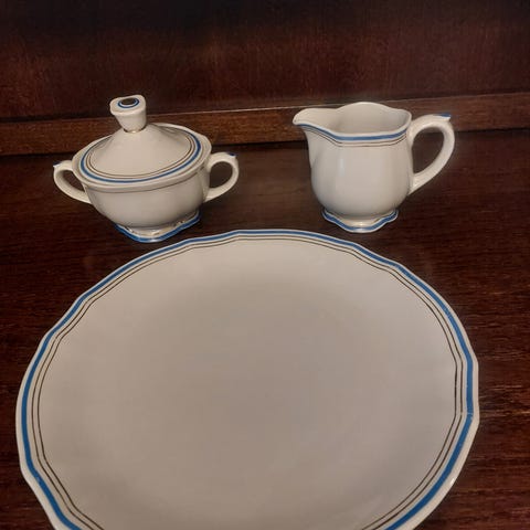 Käyttämättömät ruotsalaisen Rörstrandin Tosca -sarjan sokerikko ja kermakko. Sokerikon kultareunus aavistuksen haalistunut, muutoin todella siistit.