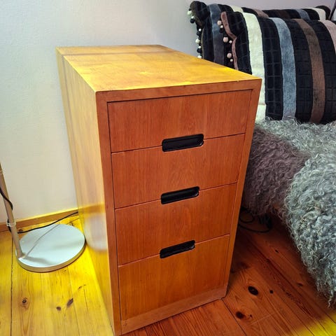 80-luvun Artekin laatikosto myytävänä. Sokkeliin asennettu pienet pyörät, jotka poistettavissa. Kolhua ja jälkiä ympäriinsä. Runko ehjä ja vetolaatikot toimivat. Ei hajuja.