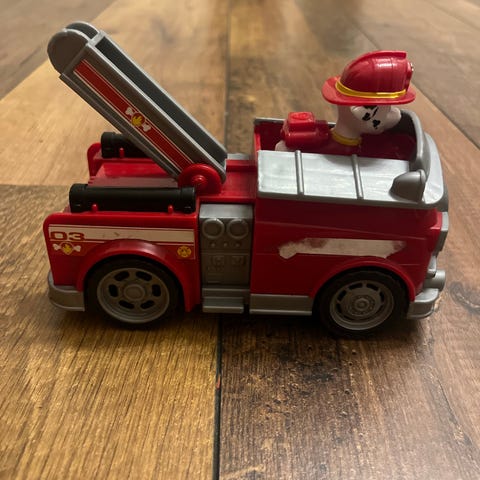Ryhmä Hau Palomiesauto lelu. Sisältää hahmon ja liikkuvia osia, kuten tikkaat ja vesitykin.